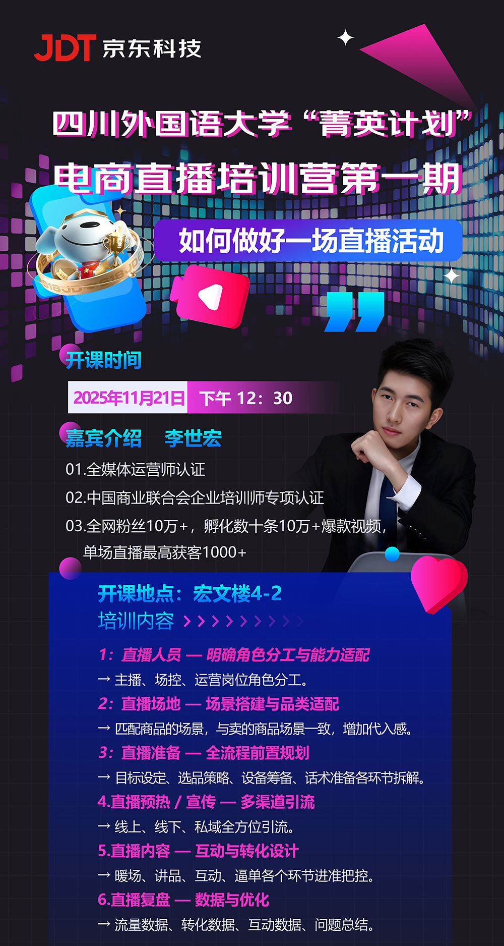 2025年11月21日中午12:30,四川外国语大学宏文楼4-2教室内气氛热烈,四川外国语大学“菁英计划”电商直播培训营第一期正式启动。本次活动由京东(重庆)数字经济产业园主办,四川外国语大学多语种跨境电商产业学院与重庆京森科技有限公司共同承办,吸引了80余名学子踊跃参与,共同开启一场以“如何做好一场直播活动”为主题的实战型培训课程。
