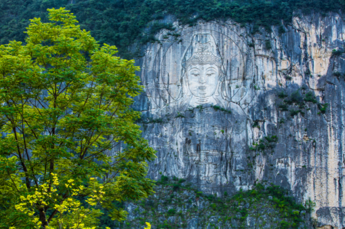 在高达123米的世界最高巨幅摩崖观音像前